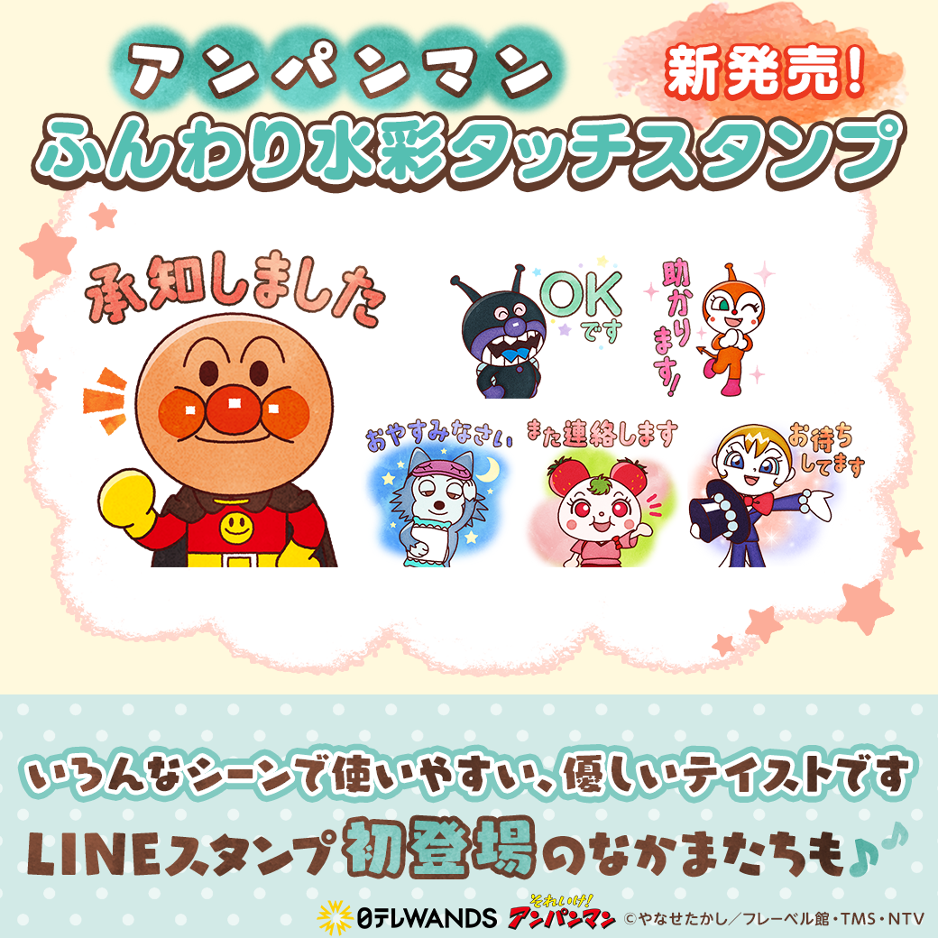 株式会社日テレWands(本社:東京都港区、代表取締役社長:鈴木 重利、以下、日テレWands)は、 LINEヤフー株式会社が運営するコミュニケーションアプリ「LINE」内のスタンプショップとLINEの公式オンラインストアLINE STOREにて、アンパンマンLINEスタンプ初の水彩タッチスタンプ「アンパンマン ふんわり水彩タッチスタンプ」の配信を開始いたしました。