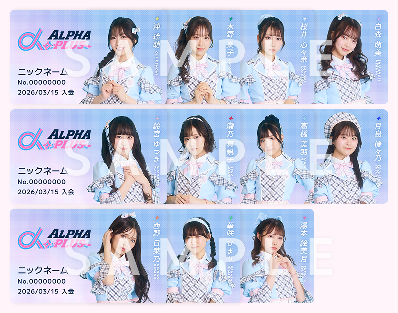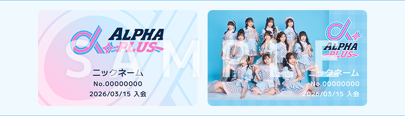 株式会社VAZと株式会社TWIN PLANETの両者によるアイドルプロジェクトから誕生した、「α+(アルファプラス)」のファンクラブサイト。ファンクラブ限定のイベント・公演の先行販売や、FC限定のムービー・ギャラリーなどコンテンツを盛りだくさんでお届けします♪ 「メンバー個別メッセージプラン」では、推しメン本人からメッセージが届く特典もご用意しています!